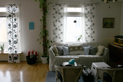 Samtidigt som jag målade i köket hade jag ett sidoprojekt. Jag hittade nämligen en gammal sliten möbel i källaren som gamla ägaren lämnade kvar (ni vet ju att han lämnat kvar en hel del i källaren som jag faktiskt kunnat ha nytta av efter lite förvandling!!) . Jag målade den vit och satte på lite svart dekorplast. Det är en ganska smal möbel så den passar fantastiskt till DVD-förvaring. Vi har fram tills nu haft en "öppen" förvaring av dessa och det är så tråkigt att titta på! Jag gjorde en tavla till av tyget jag köpte på IKEA och CD-skivorna fick ta plats i lådorna under hyllan! Vad tycks?